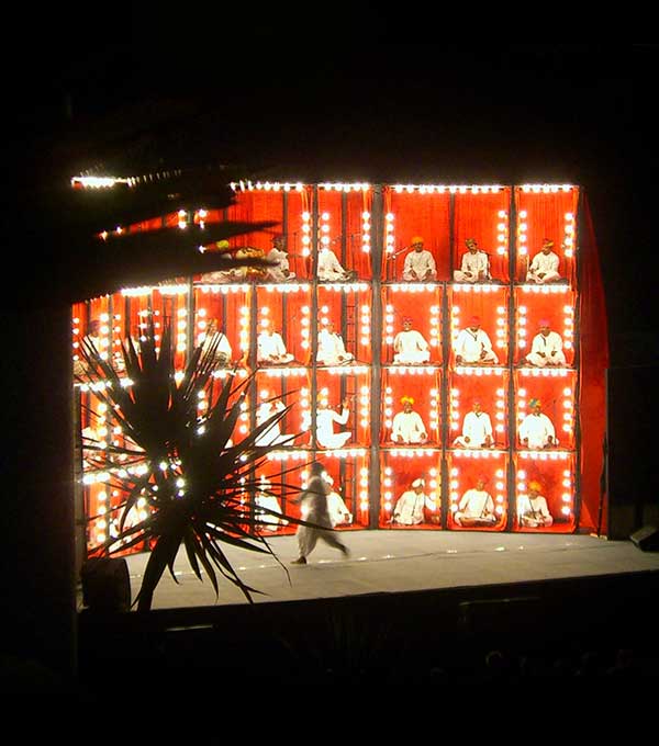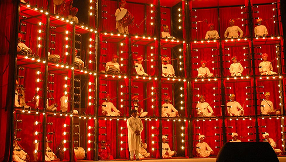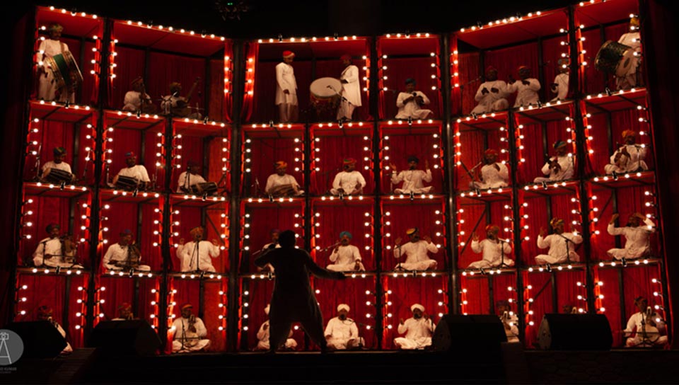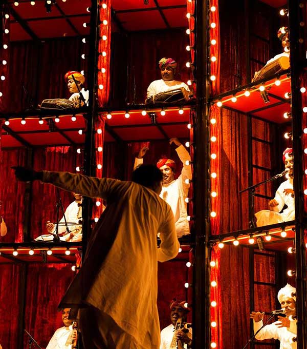 Directed by Roysten Abel, this grand ensemble of 40+ Rajasthani musicians offers a mesmerizing auditory and visual experience. Performers occupy glowing pods stacked in a four-story structure, their music intensifying as more pods light up. A powerful synthesis of sound and spectacle, this performance is an unforgettable celebration of Rajasthan’s musical heritage.